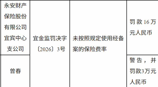 盛宝策略配资APP下载 永安财产保险宜宾中心支公司因未按照规定使用经备案的保险费率被罚款16万元人民币 保险 来源:恒牛所配资APP下载 网站:广源优配 日期:2026-01-20 07:59:48 查看:159