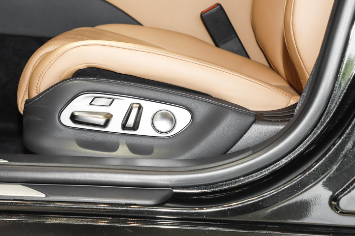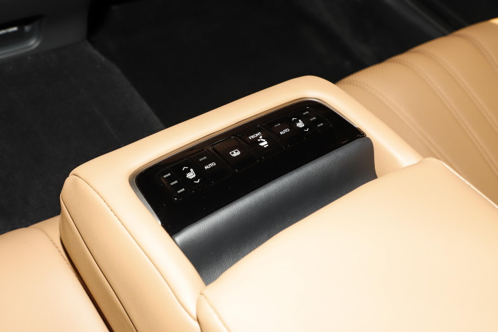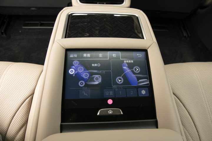 接着追加8万元来到了豪华版,指导价104万,多了后排座椅防下滑气囊,可开启全景天窗,二排18向电动调节座椅,包含了高低调节、靠背角度调节、肩部调节、腰部调节,并支持通风、记忆,还升级了全车共23个扬声器的马克莱文森音响,并带有后排多媒体控制,其他升级的还有后窗侧遮阳帘、以及四区控制的空调。