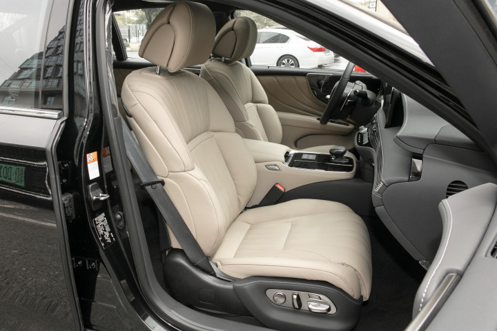 加7.5万来到了臻越版,指导价96万,升级了半本胺高级真皮座椅,支持28向电动调节,带有主驾座椅肩部调节,前排安全带自动伸缩,感应式后尾门、HUD抬头显示。